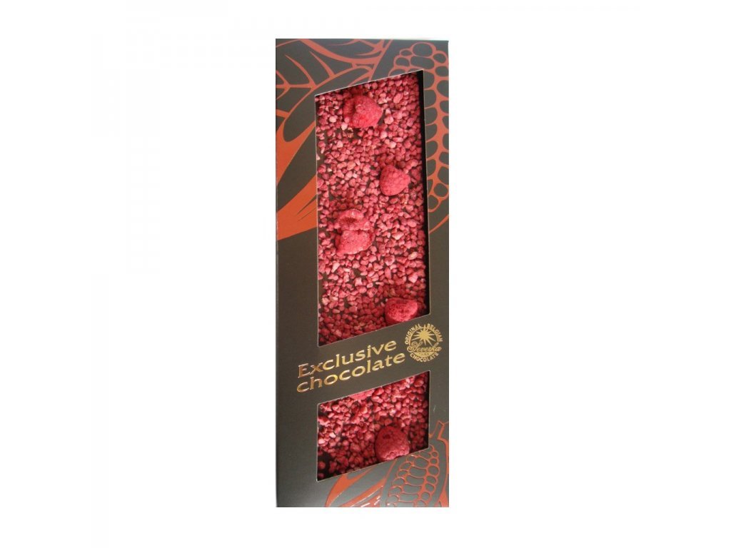 Složení: kakaová hmota 54,3%, cukr 36%, lyofilizované maliny 6%, kakaové máslo 3,2%, emulgátor - sojový lecitin 0,5%, aroma - přírodní vanilka