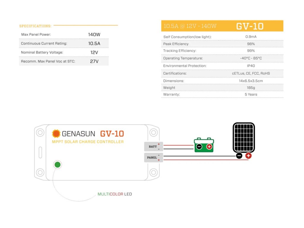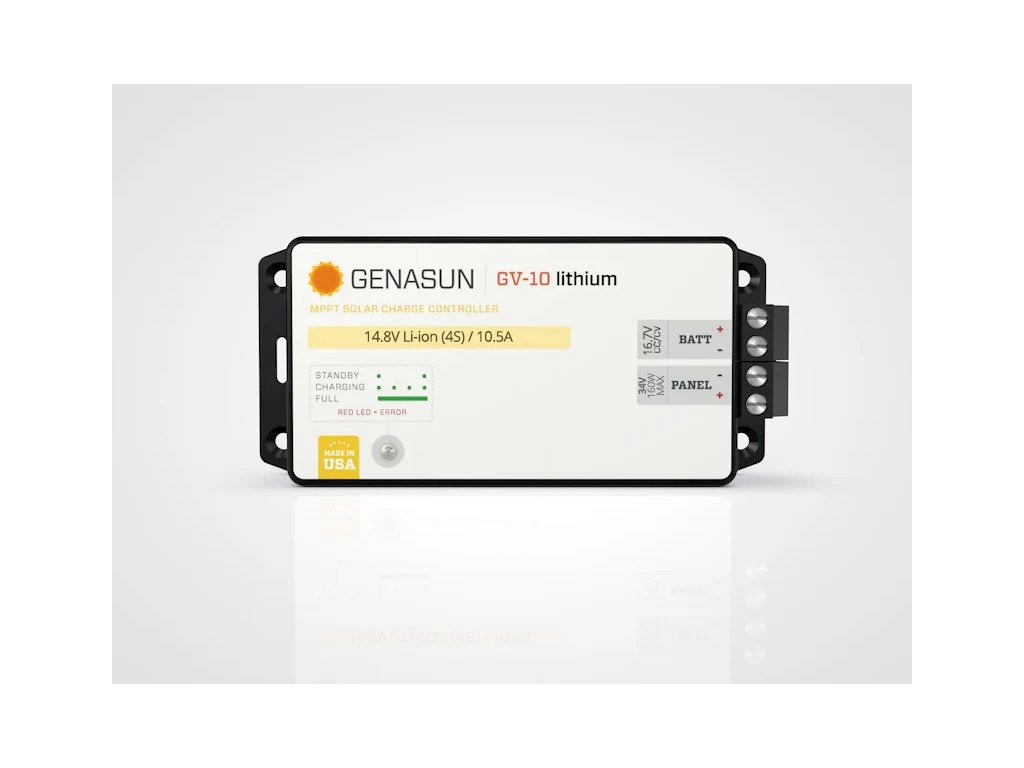 - S MPPT regulátorem Genasun GV-10 máte nepřetržitý výkon k dispozici. GV-10 získává z jakéhokoli panelu více energie než PWM regulátor nebo jiné MPPT regulátory.