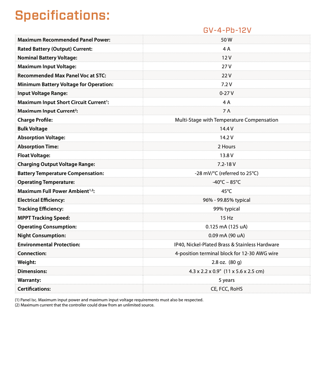 - Tento MPPT regulátor s výkonem 50 W a napětím 4 A, 12 V je malý, účinný a cenově dostupný. GV-4 získává z jakéhokoli panelu více energie než PWM regulátor. A ačkoli PWM mohou nabízet nižší cenu regulátoru, MPPT regulátor Genasun poskytuje více energie – snižuje náklady na watt o 10–30 % a nabízí vám lepší poměr ceny a výkonu.