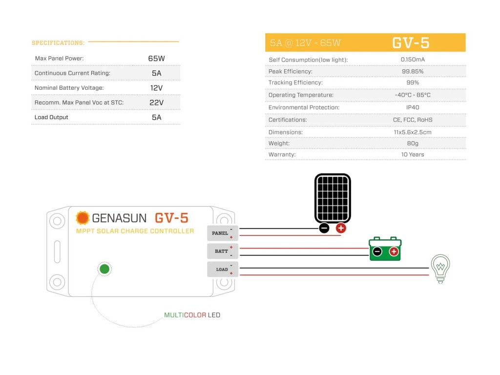 • Regulátor Genasun GV-5 MPPT nastavuje nový standard spolehlivosti. Tento 65W 5A 4-stupňový 12V MPPT regulátor solárního nabíjení s nabíjením baterie a špičkovou účinností 99,85 % získává z jakéhokoli panelu více energie než PWM regulátor. A ačkoli PWM mohou nabízet nižší cenu regulátoru, regulátor Genasun MPPT poskytuje více energie – snižuje náklady na watt o 10 % – 30 % a poskytuje vám lepší poměr ceny a výkonu. A mimochodem, jeho keramické kondenzátory se nikdy neopotřebují,