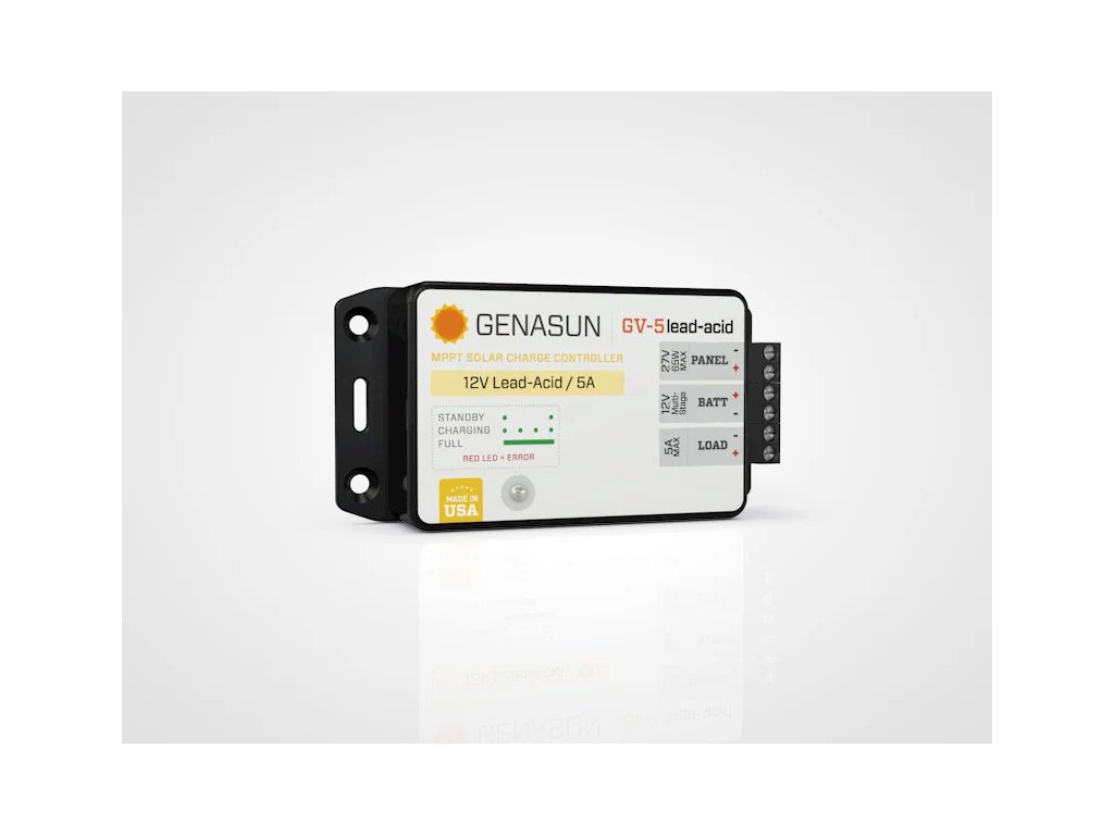 - Regulátor Genasun GV-5 MPPT nastavuje nový standard spolehlivosti. Tento 65W 5A 4-stupňový 12V MPPT regulátor solárního nabíjení s nabíjením baterie a špičkovou účinností 99,85 % získává z jakéhokoli panelu více energie než PWM regulátor. A ačkoli PWM mohou nabízet nižší cenu regulátoru, regulátor Genasun MPPT poskytuje více energie – snižuje náklady na watt o 10 % – 30 % a poskytuje vám lepší poměr ceny a výkonu. A mimochodem, jeho keramické kondenzátory se nikdy neopotřebují,
