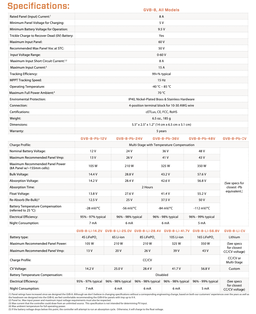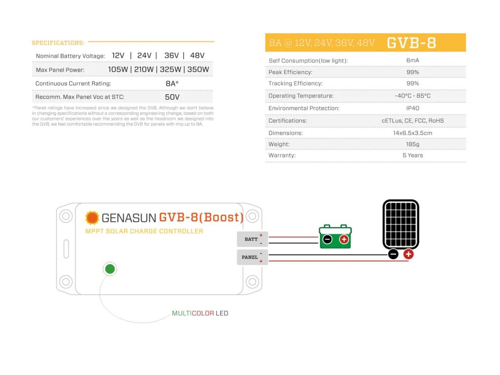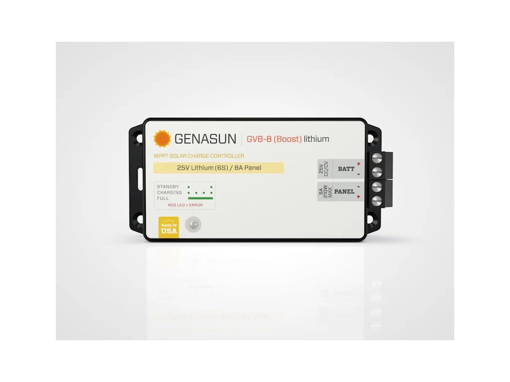 - Unikátní vodotěsný regulátor nabíjení GVB-8 Boost s MPPT je skutečným řešením problémů a umožňuje nabíjet baterie s vyšším napětím z nízkonapěťového solárního panelu. Chcete nabíjet 24V baterii pomocí 48článkového solárního panelu (nominální napětí 20 V)? Žádný problém. 48V baterii z 36článkového panelu (nominální napětí 12 V)? S 99% špičkovou účinností jsou to nejúčinnější regulátory zvyšující napětí v oboru. True MPPT poskytuje konzistentní výkon, na rozdíl od „nominálního MPPT“ konkurence.