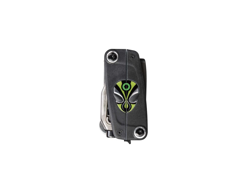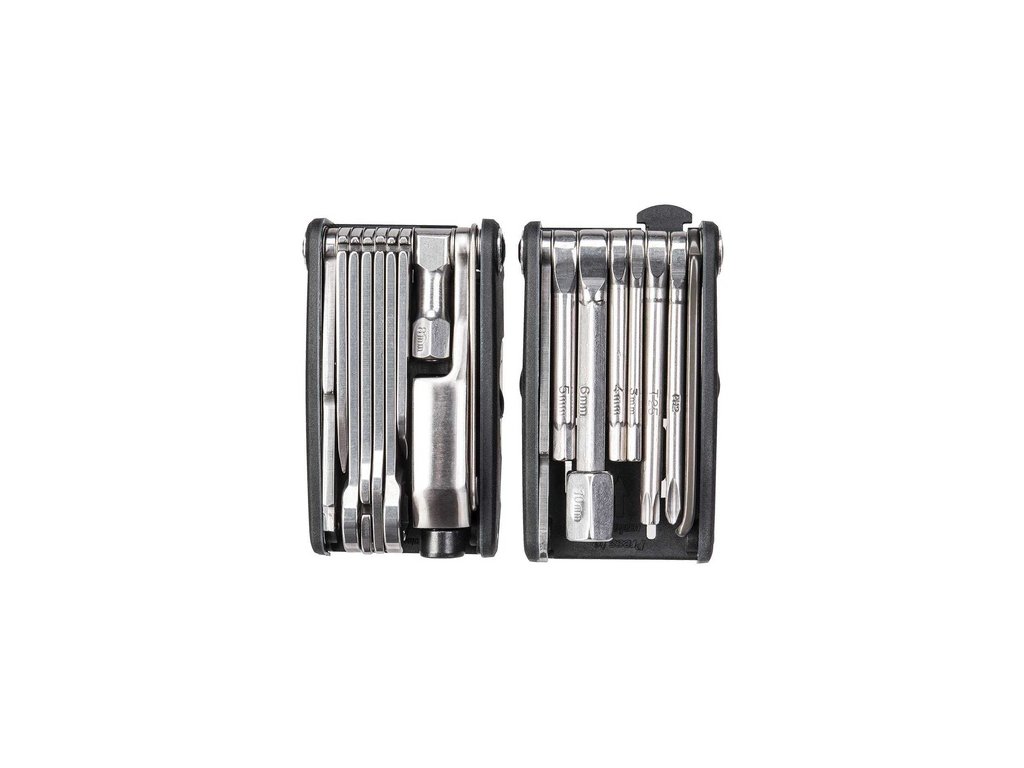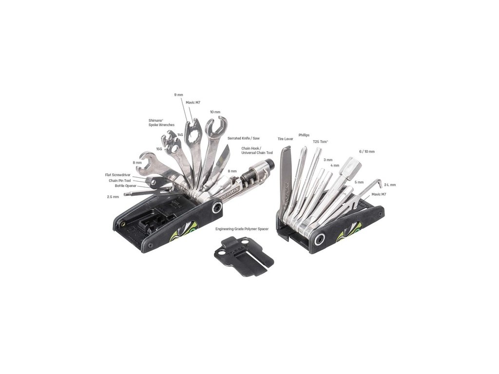 - nástroje: Inbusy 2-L / 2.5 / 3 / 4 / 5 / 6 / 8 / 10 mm, T25 Torx®, 8 / 9 / 10 mm klíče, 14G / 15G / Mavic m7 / Shimano® center klíče, nýtovač, háček na řetěz, odolné montpáky, křížový a plochý šroubovák, rozdělený nůž s pilkou, otvírák lahví, bottle opener, servisní vložka do čelisti kotoučových brzd