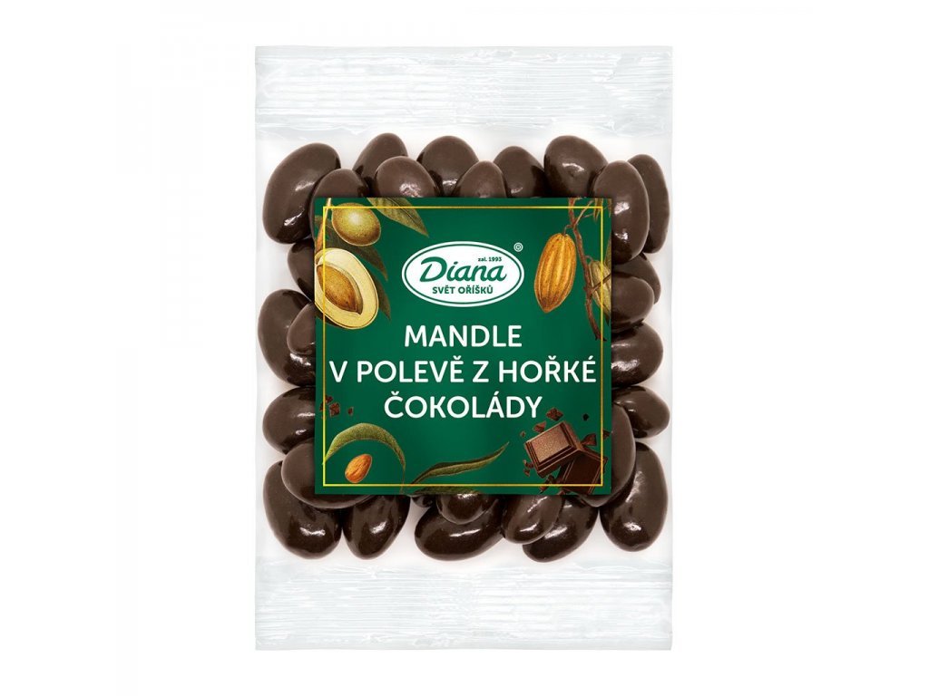 Složení: poleva z hořké čokolády 67% (cukr, kakaová hmota, rostlinný tuk palmový,kakaové máslo, syrovátka z mléka, slunečnicový lecitin E322, arabská guma, šelak E904, obsah kakaa v sušině min.35%), mandle 33%