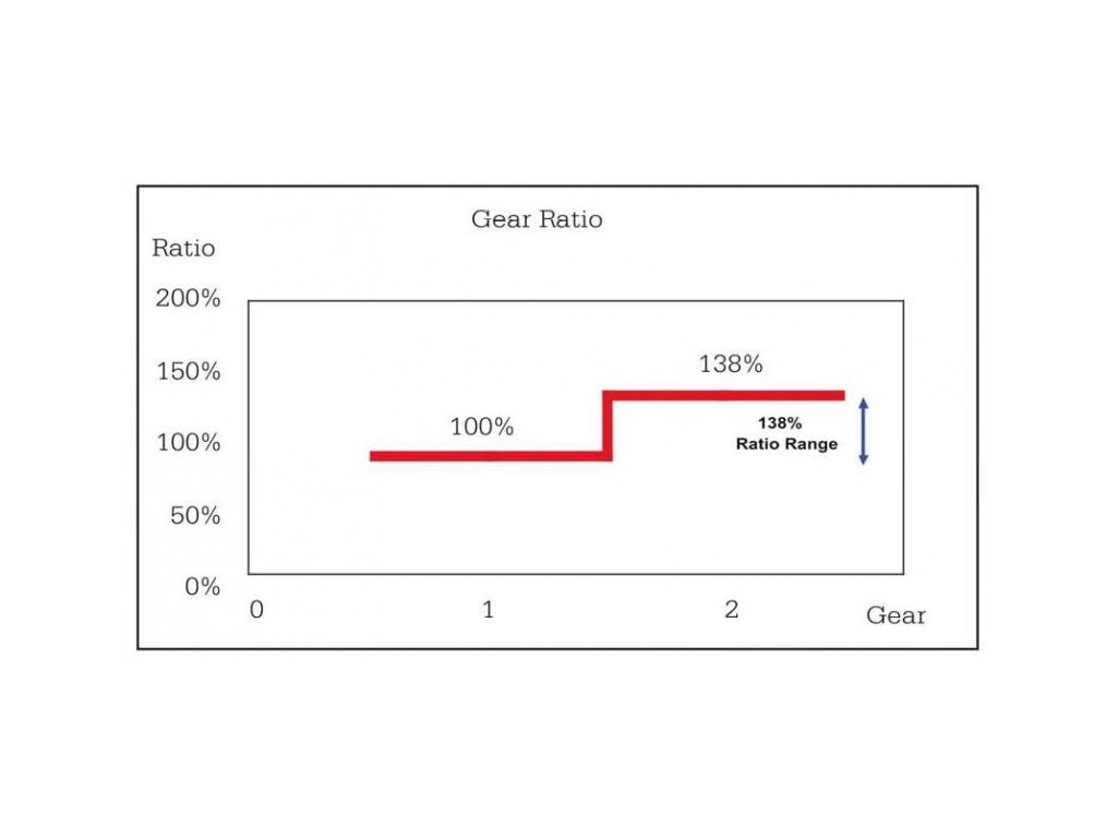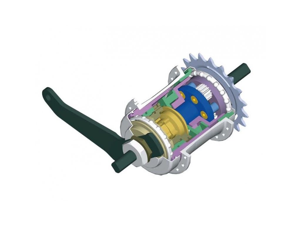 2-rychlostní náboj Sturmey-Archer S2C Kick-Shift s řazením nohou a rozsahem 138%.