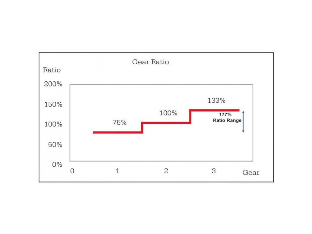 3-rychlostní náboj Sturmey-Archer X-RD3 s rozsahem 177% a bubnovou brzdou 70 mm.