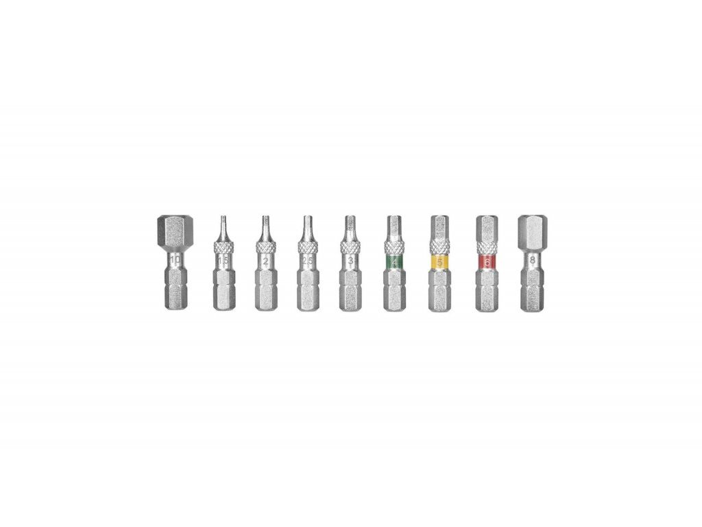 Sada 9 kusů kvalitních inbus bitů pro opravu a údržbu silničních i horských kol. Navrženo pro práci s ráčnami a momentovými klíči. Velkorysá délka bitu 30 mm usnadňuje přístup do těžko dostupných míst a rýhování usnadňuje manipulaci při výměně bitů nebo vyjímání bitů z organizéru.