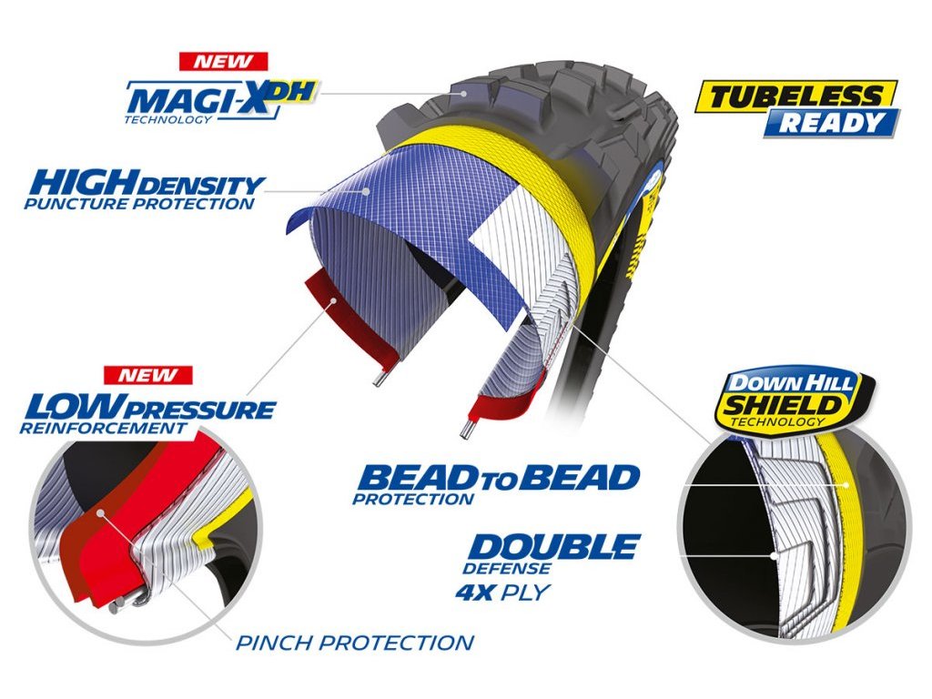 Nejrychlejší sjezdově orientovaný plášť MICHELIN. Díky gumové směsi Magi-X DH poskytuje ty nejlepší jízdní vlastnosti na tvrdém a kamenitém podkladu. Dvojitá zesílená ochranná vrstva pak zajišťuje spolehlivou ochranu proti defektu a podporu boční stěny při nižším tlaku pláště.