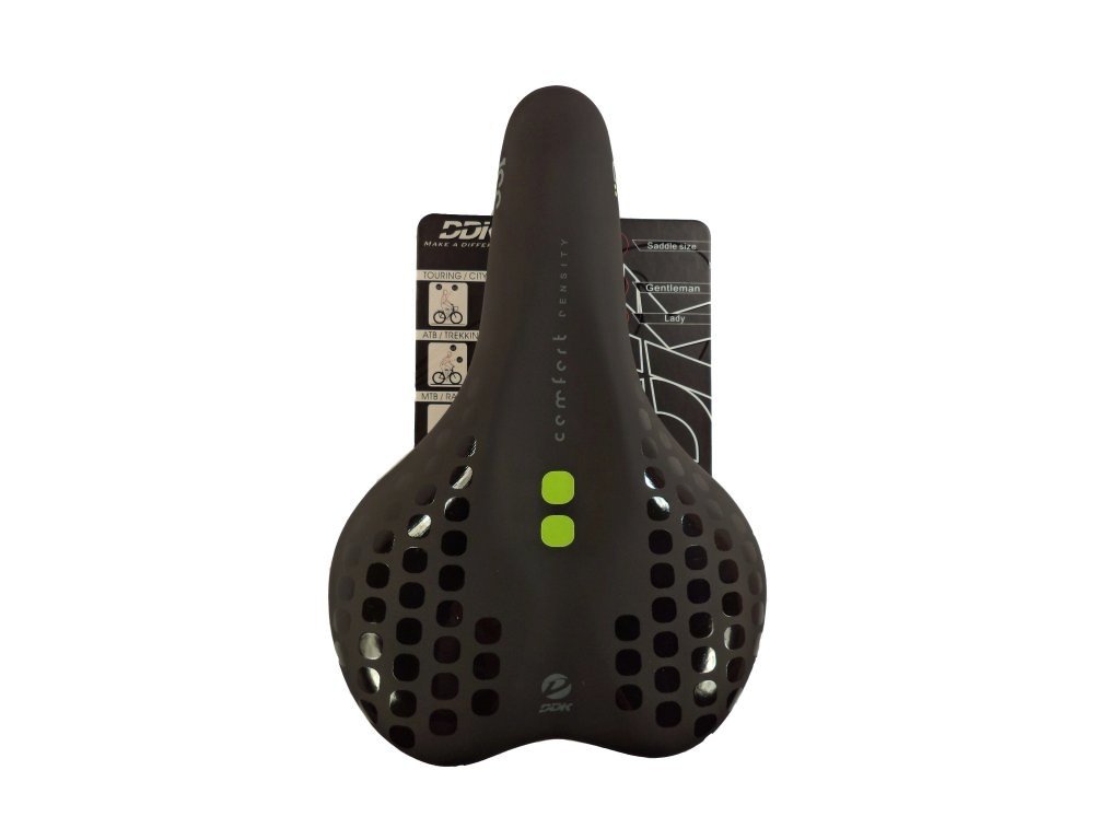 -Rozměry: 270x175 mm-Ocelové vzpěry bez zámku sedla -Tvrdost - středně tvrdé polstrování-Barva: černo-zelená-Baleno na kartě DDK-Hmotnost-361g.