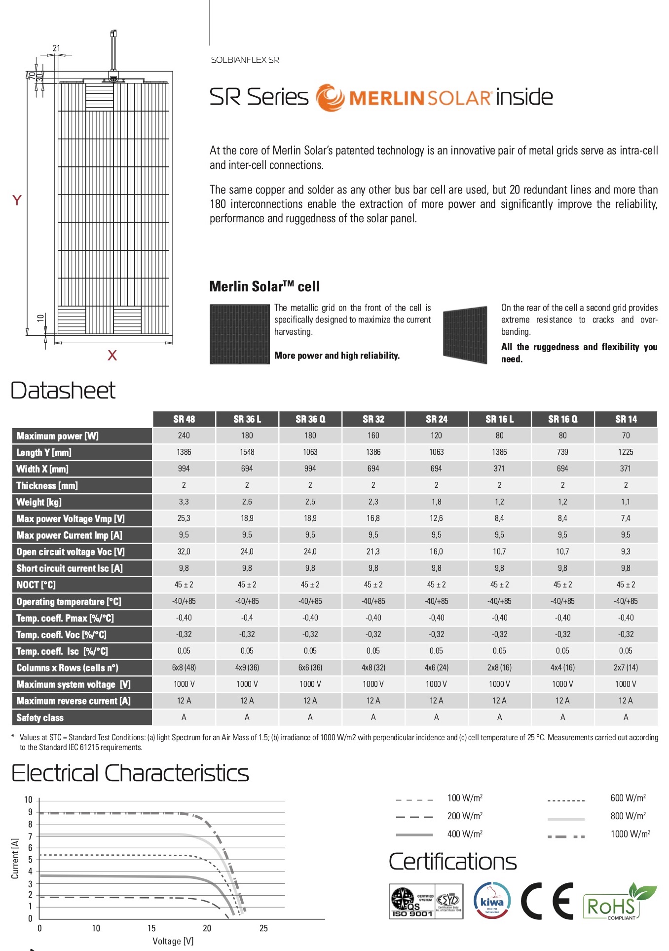 Řada SR má monokrystalické vysoce účinné články, které jsou obklopeny dvěma patentovanými kovovými mřížkami. Mřížka na přední straně je pečlivě navržena pro optimalizaci sběru proudu, zatímco mřížka za článkem nabízí silnou mechanickou oporu. Mřížky v podstatě tvoří dvojitý štít, který slouží jako vodivá výztuha solárního článku.