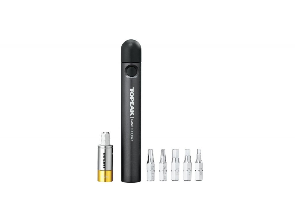 Miniaturní momentový momentový klíč s 5Nm nástavcem a sadou základních bitů zamezující poškození, vzniklému přetažením, například drahých karbonových částí. Dva bity mohou být umístěny přímo v těle klíče.