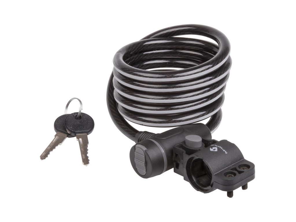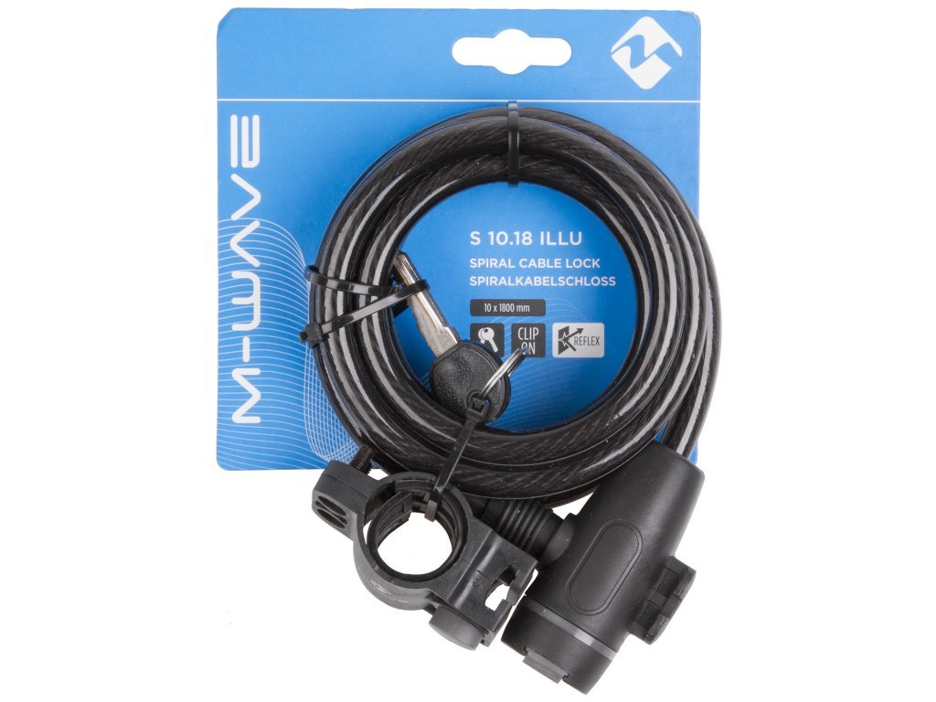 Průměr lanka: 10 mm Délka lanka: 1800 mmDržák k uchycení na sedlovku nebo k rámuOchranný kryt proti prachuReflexní proužek Barva: černá transparentní Balení obsahuje 2 klíče Balení: originální karta M-Wave