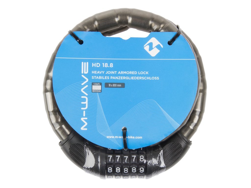 Průměr lanka: 18 mm Délka lanka: 800 mmMateriál: kovové články + transparentní potahBarva: černá transparentníUzamykání pomocí nastavitelného bezpečnostního kódu Balení: karta M-Wave